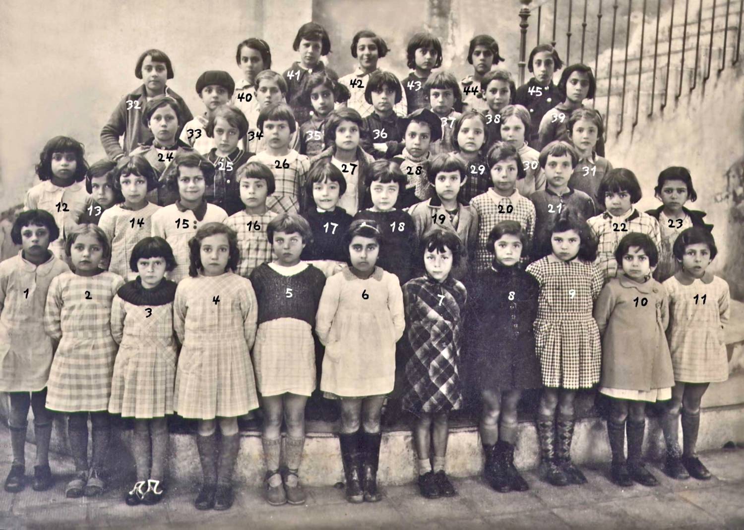 | 18 | 19 Marie Antoinette Gimenez | 20 Lucie Garguilo | 21 Marcelle Sanchez | 22 Marie Jeanne Gimenez | 23 Lydie Sanchez | 24 Lucette Emanuel | 25 Jeannot Lopez | 26 Louis Scotto di Uccio | 27 |