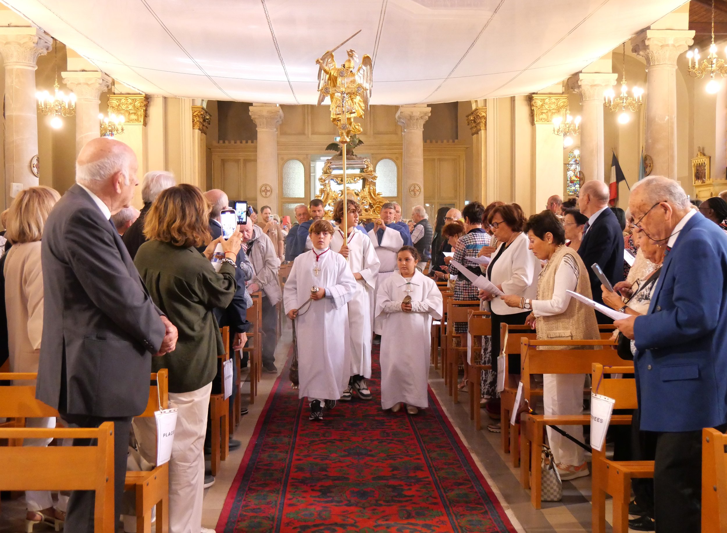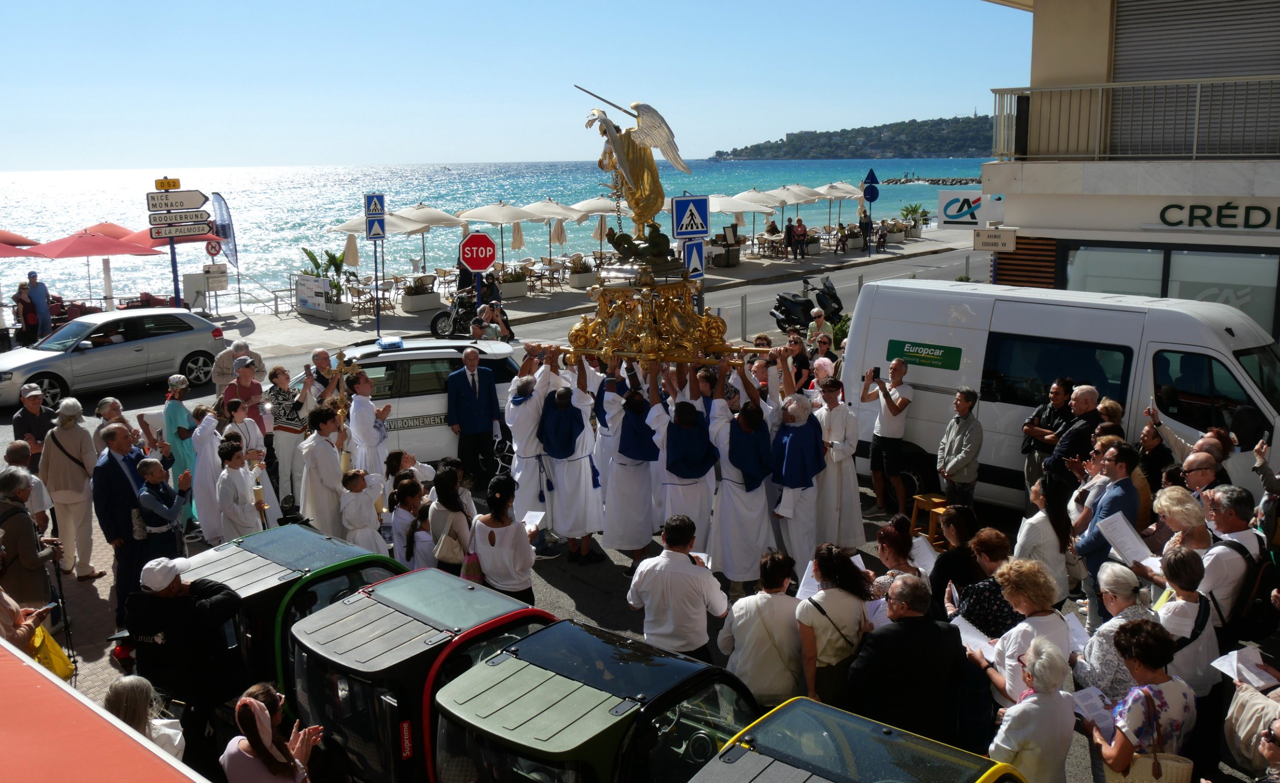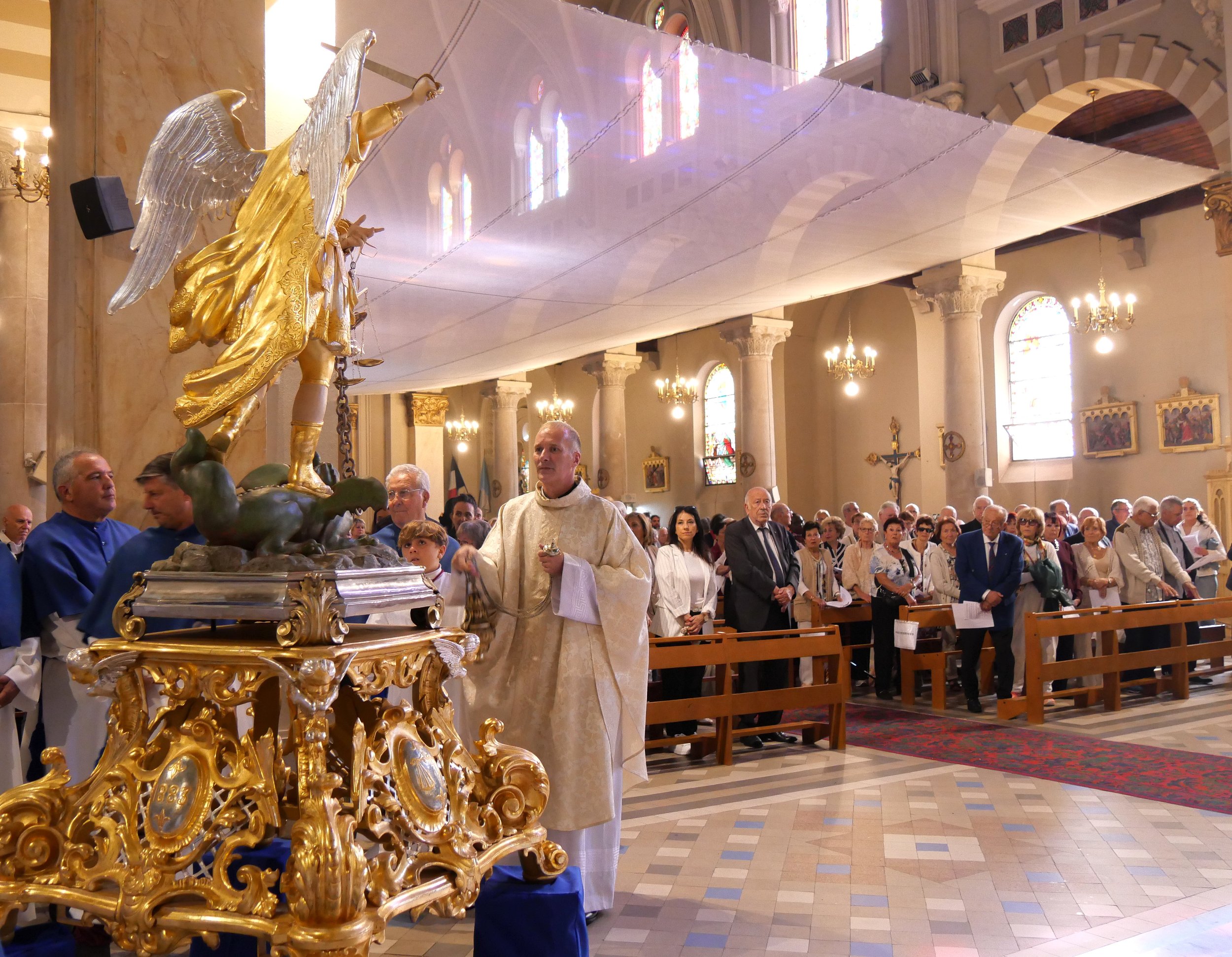 À la fois solennelles et festives, les réjouissances se sont déroulées avec la statue de saint Michel de Mers-el-Kébir, rapatriée d’Algérie en 1967. La messe a été officiée par le père Régis Peillon, curé-archiprêtre de la paroisse Notre-Dame des Rencontres, et animée par la chorale paroissiale Soli Deo Gloria, dirigée par Hervé Féraud et accompagnée par l’organiste Angelica Murante. Puis, le cortège a emprunté l’avenue Edouard VII jusqu’au rivage où le père Régis a béni la mer, les pêcheurs disparus, les défunts demeurés en terre algérienne ainsi que les morts d’aujourd’hui en Méditerranée. La procession a ensuite fait place aux agapes dans la salle Bonfante.